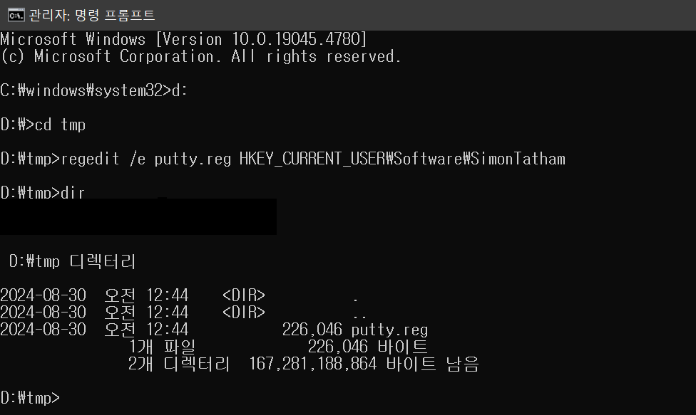 putty 설정파일을 백업하려면 관리자 권한으로 명령 프롬프트에서 아래 명령을 실행하면 reg 파일로 백업할 수 있습니다.